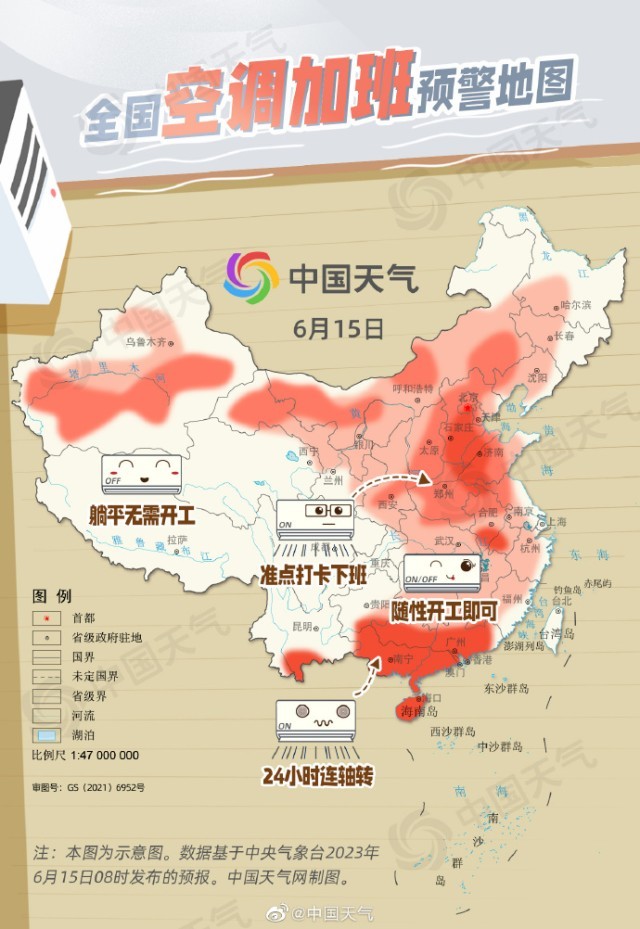 眼下,我國北方今年以來最大範圍高溫天氣仍在持續中,今明兩(liang) 天(6月15日-16日)強度將達到鼎盛,京津冀等7省區市部分地區將出現37℃以上的高溫天氣,局地甚至會(hui) 挑戰同期最熱紀錄。江南、華南等地雖沒有高溫天氣,但體(ti) 感也相當悶熱。@中國天氣 特別推出全國空調加班預警地圖,看哪裏的空調需要24小時連軸轉。
