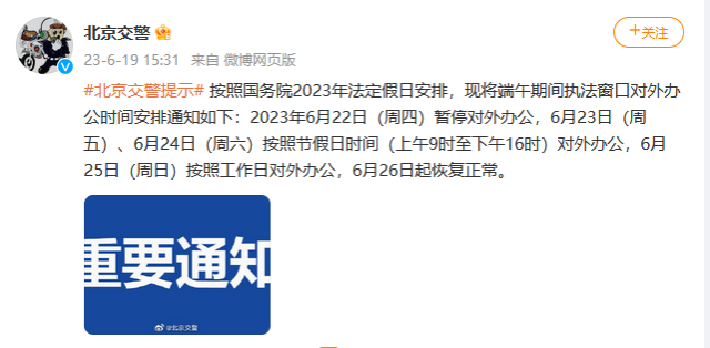 央視網消息:據北京交警微博消息,按照國務院2023年法定假日安排,現將端午期間執法窗口對外辦公時間安排通知如下:2023年6月22日(周四)暫停對外辦公,6月23日(周五)、6月24日(周六)按照節假日時間(上午9時至下午16時)對外辦公,6月25日(周日)按照工作日對外辦公,6月26日起恢複正常。