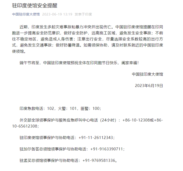 央視網消息:中國駐印度大使館官微6月19日發布安全提醒,內(nei) 容如下: