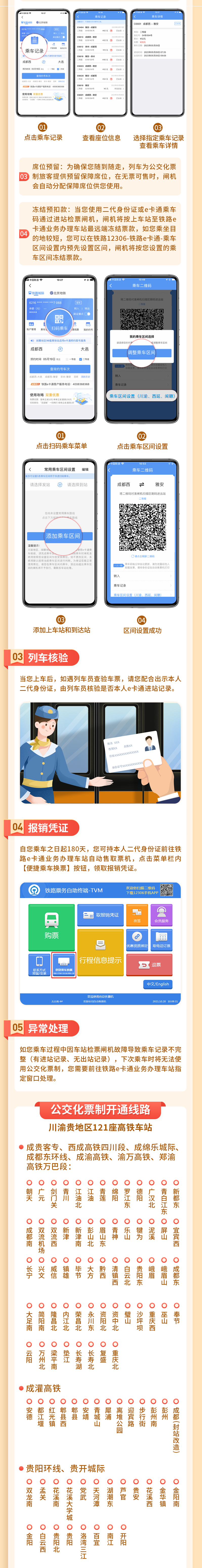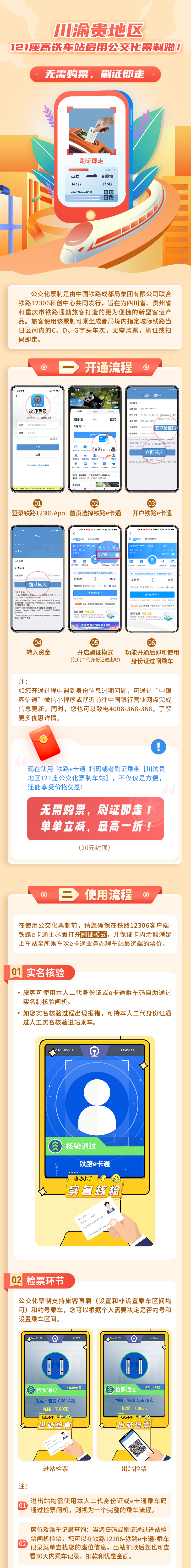為(wei) 進一步提升通勤旅客出行體(ti) 驗,中國鐵路成都局集團有限公司管內(nei) 的川渝貴地區121座高鐵車站啟用公交化票製。已開通鐵路e卡通的旅客在鐵路12306客戶端-鐵路e卡通主頁,啟用刷證模式,即可使用二代身份證或e卡通乘車碼,實現無需購票,刷證或掃碼即走。