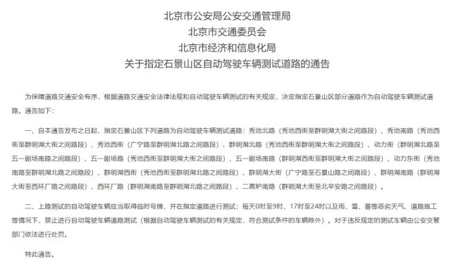 為(wei) 保障道路交通安全有序,根據道路交通安全法律法規和自動駕駛車輛測試的有關(guan) 規定,決(jue) 定指定石景山區部分道路作為(wei) 自動駕駛車輛測試道路。