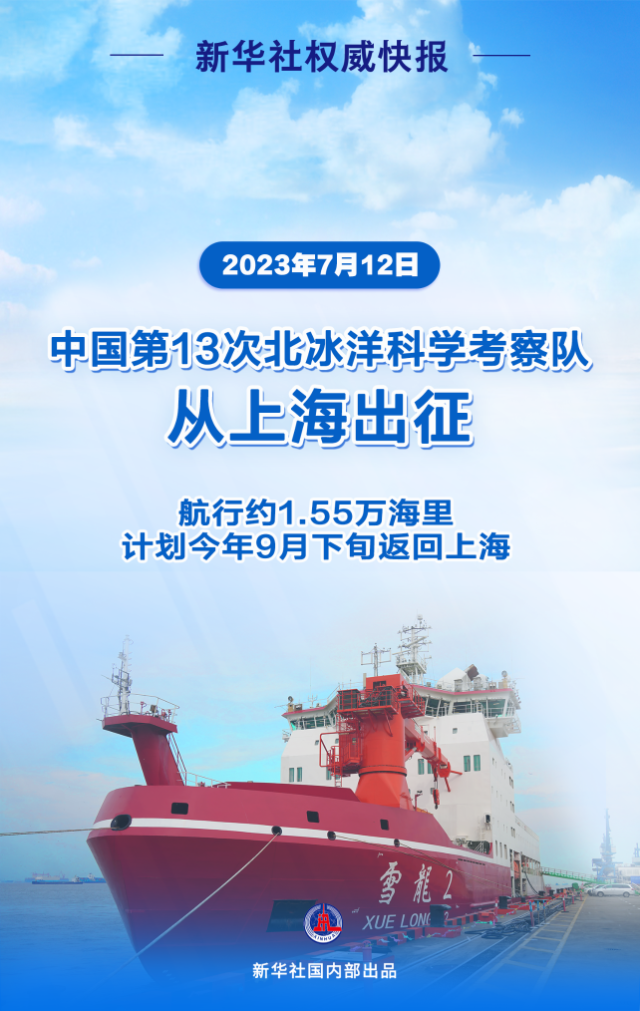 7月12日,由自然資源部組織的中國第13次北冰洋科學考察隊,乘坐“雪龍2”號極地科考破冰船,從(cong) 上海出征,前往北冰洋執行科學考察任務。本次考察預計總航程約1.55萬(wan) 海裏,計劃今年9月下旬返回上海。