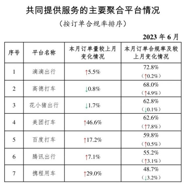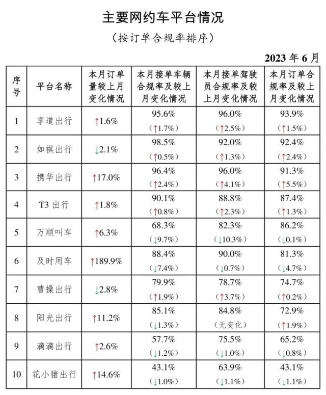 其中,麵向乘客、與(yu) 網約車平台公司共同提供服務的平台(俗稱“聚合平台”)完成2.18億(yi) 單,環比上升4.0%。按訂單合規率由高到低的分別是滴滴出行、高德打車、花小豬出行、美團打車、百度打車、騰訊出行、攜程用車。