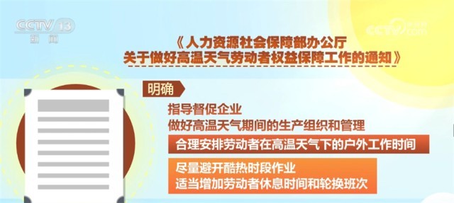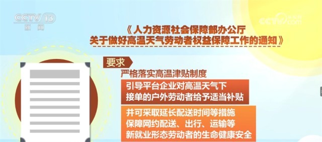 央視網消息:近日,人力資源和社會(hui) 保障部就做好高溫天氣勞動者權益保障工作印發《通知》。其中,對快遞、外賣人員等靈活就業(ye) 人員的高溫天氣下如何保障做出了專(zhuan) 門的要求。