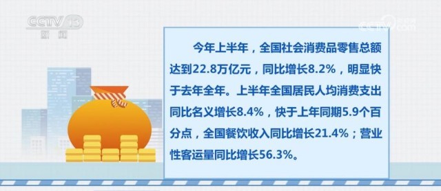今年上半年,全國社會(hui) 消費品零售總額達到22.8萬(wan) 億(yi) 元,同比增長8.2%,明顯快於(yu) 去年全年。上半年全國居民人均消費支出同比名義(yi) 增長8.4%,快於(yu) 上年同期5.9個(ge) 百分點,全國餐飲收入同比增長21.4%;營業(ye) 性客運量同比增長56.3%。