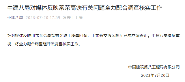 央視網消息:據“中建八局”公眾(zhong) 號消息,中國建築第八工程局有限公司表示,針對媒體(ti) 反映山東(dong) 萊榮高鐵有關(guan) 施工質量問題,山東(dong) 省交通運輸廳已成立調查組。中建八局高度重視,將全力配合調查組開展調查核實工作。