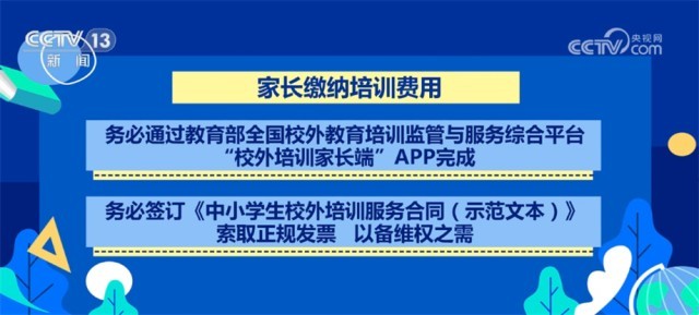 家長繳納培訓費用,務必通過教育部全國校外教育培訓監管與(yu) 服務綜合平台“校外培訓家長端”APP完成;務必簽訂《中小學生校外培訓服務合同(示範文本)》,索取正規發票,以備維權之需;務必控製額度,一次性繳費不要超過3個(ge) 月或60課時,且不要超過5000元,切勿受“充值贈送”等方式誘惑,繳納高額培訓費。