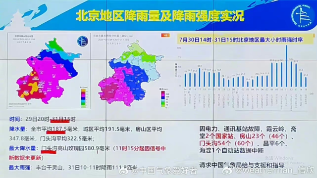 該消息配圖“北京地區降雨量及降雨強度實況”顯示,因電力、通訊基站故障,霞雲(yun) 嶺、齋堂2個(ge) 國家站、房山23個(ge) (46個(ge) )、門頭溝54個(ge) (60個(ge) )、昌平6個(ge) 、海澱1個(ge) 自動站數據中斷。請求中國氣象局給予支援和指導。