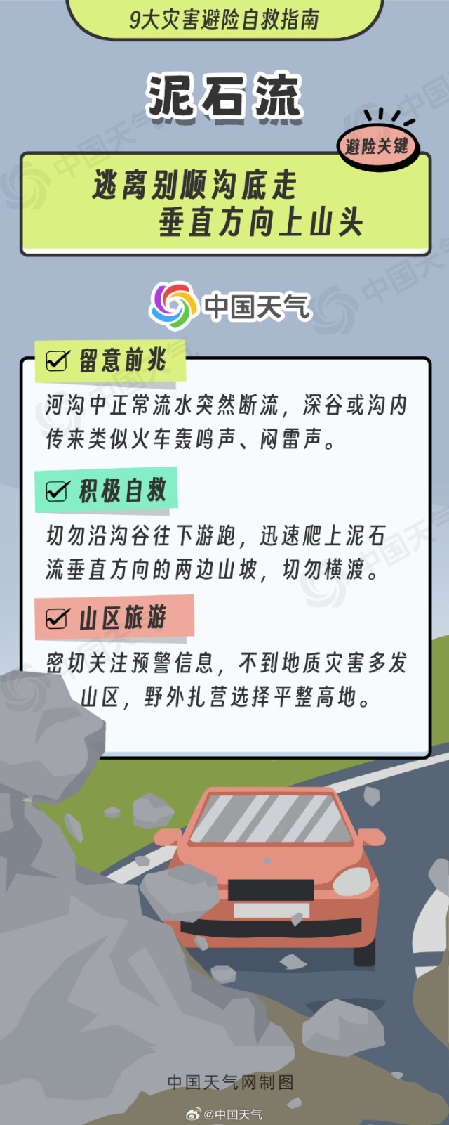 雨後山區道路沿線易發生落石,大家請避免在陡峭石壁或凸石下停留,當災害發生時要迅速向崩塌體(ti) 兩(liang) 側(ce) 逃生;房前屋後土體(ti) 突然鼓脹,局部出現滑塌或裂縫,並有水流滲出時,要警惕滑坡災害,快速向滑動方向兩(liang) 側(ce) 逃離;地麵出現環狀裂縫,地形下凹或地表水快速滲漏,建築物出現傾(qing) 斜開裂時,要迅速遠離沉陷地帶。