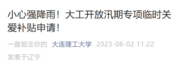 近日,多地出現強降雨天氣,部分地區汛情嚴(yan) 重。西北工業(ye) 大學、華東(dong) 師範大學、廈門大學、上海交通大學、中山大學、大連理工大學、同濟大學等高校相繼發聲:受災學生可向學校申請補助。