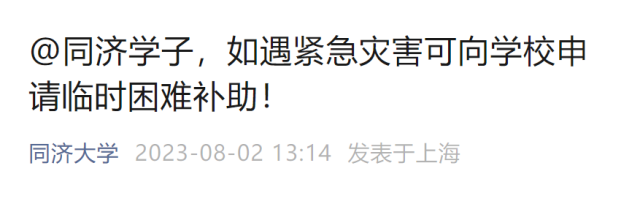 為(wei) 積極應對並及時為(wei) 同濟學子提供關(guan) 心和幫扶,學校設立同濟大學2023年暑期受災地區學生專(zhuan) 項補貼(含2023級錄取新生),如你及你的家庭遇到各類緊急災害、突發事件(不限於(yu) 台風災害),請及時聯係所在學院的輔導員說明情況,提出緊急災害專(zhuan) 項救助申請。