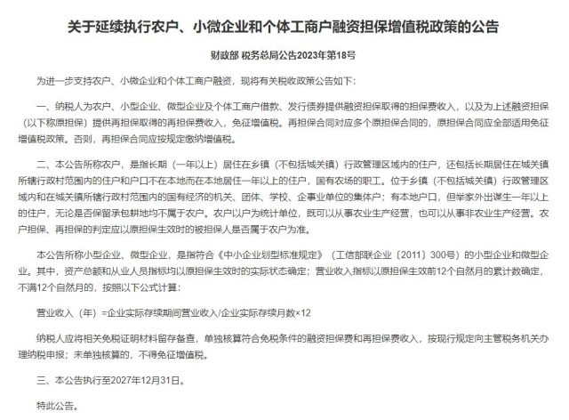 兩部門:延續執行農戶、小微企業和個體工商戶融資擔保增值稅政策