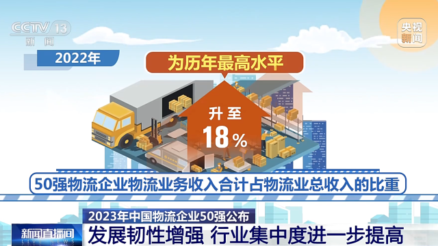 中國物流與(yu) 采購聯合會(hui) 今天發布了2023年度中國物流企業(ye) 50強。從(cong) 物流業(ye) 務收入占比來看,50強物流企業(ye) 的物流業(ye) 務收入占物流業(ye) 總收入的比重升至曆年最高,並且50強物流企業(ye) 門檻大幅提高,顯示物流行業(ye) 發展韌性較強,行業(ye) 集中度進一步提高。