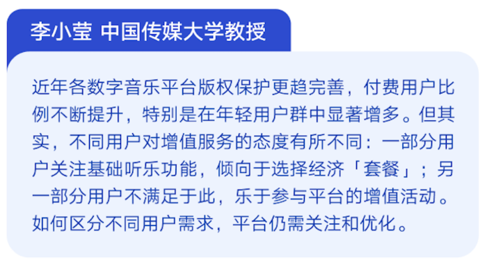 “近年各數字音樂(le) 平台版權保護更趨完善,付費用戶比例不斷提升,特別是在年輕用戶群中顯著增多”,中國傳(chuan) 媒大學教授李小瑩指出,不同用戶對增值服務的態度有所不同:一部分用戶關(guan) 注基礎聽樂(le) 功能,傾(qing) 向於(yu) 選擇經濟“套餐”;另一部分用戶不滿足於(yu) 此,樂(le) 於(yu) 參與(yu) 平台的增值活動。