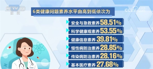 6類健康問題素養(yang) 水平由高到低依次為(wei) :安全與(yu) 急救素養(yang) 58.51%、科學健康觀素養(yang) 53.55%、健康信息素養(yang) 39.81%、慢性病防治素養(yang) 28.85%、傳(chuan) 染病防治素養(yang) 28.16%和基本醫療素養(yang) 27.68%。各類健康問題素養(yang) 均有不同程度提升,其中,健康信息素養(yang) 水平增幅最大,較2021年提升了3.88個(ge) 百分點。本次監測覆蓋31個(ge) 省(自治區、直轄市)的336個(ge) 縣(區)1008個(ge) 鄉(xiang) 鎮(街道),對象為(wei) 15—69歲常住人口。