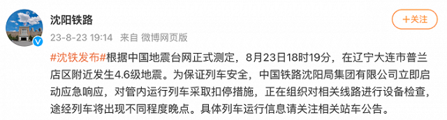 央視網消息:據@沈陽鐵路 微博消息,根據中國地震台網正式測定,8月23日18時19分,在遼寧大連市普蘭(lan) 店區附近發生4.6級地震。為(wei) 保證列車安全,中國鐵路沈陽局集團有限公司立即啟動應急響應,對管內(nei) 運行列車采取扣停措施,正在組織對相關(guan) 線路進行設備檢查,途經列車將出現不同程度晚點。具體(ti) 列車運行信息請關(guan) 注相關(guan) 站車公告。