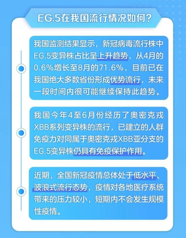 根據我國最新監測數據,新冠病毒流行株中EG.5變異株占比呈上升趨勢,從(cong) 4月的0.6%增長至目前的71.6%,已在我國絕大多數省份形成優(you) 勢流行,未來一段時間內(nei) 很可能繼續保持此趨勢。對此,國家疾控局表示,EG.5感染者與(yu) 其他XBB亞(ya) 分支感染者的臨(lin) 床分型無明顯差異,近期全國新冠疫情總體(ti) 處於(yu) 低水平、波浪式流行態勢,對各地醫療係統帶來的壓力較小。