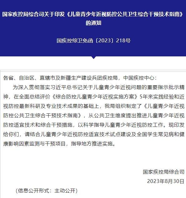國家疾控局印發《兒童青少年近視防控公共衛生綜合幹預技術指南》