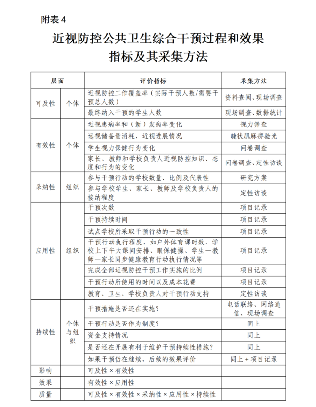 2.注重過程與(yu) 效果評價(jia) 。各級疾控機構要定期開展學生視力監測工作,深入分析曆年監測數據,將監測發現的主要學生健康問題和建議及時報告當地政府。基於(yu) 實施性研究方法,從(cong) 理論向實踐進行轉化和應用,可推進幹預行動的實施與(yu) 傳(chuan) 播。進行過程與(yu) 效果評價(jia) ,引入實施性研究框架和理論模型,如近視防控公共衛生綜合幹預過程和效果指標及其采集方法(附表4),從(cong) 個(ge) 體(ti) 層麵和組織層麵全麵評價(jia) 幹預行動的可及性、有效性、應用性、可持續性,係統性地評估兒(er) 童青少年近視公共衛生綜合幹預的實施成效。