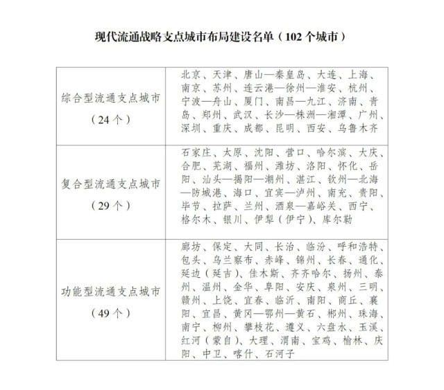 《通知》堅持係統思維和全局觀念,突出國家所需和城市所長,按照服務重要商品和資源要素流通、強化跨域跨界輻射帶動、促進現代流通發展等三個(ge) 維度布局流通支點城市。綜合考慮城市資源稟賦、發展基礎、比較優(you) 勢、未來潛力,將102個(ge) 城市納入布局建設範圍,覆蓋全國31個(ge) 省區市以及新疆生產(chan) 建設兵團。流通支點城市將按綜合型、複合型、功能型分類推進建設,城市人民政府發揮主體(ti) 作用部署推進,努力提升自身發展水平,增強輻射帶動作用。
