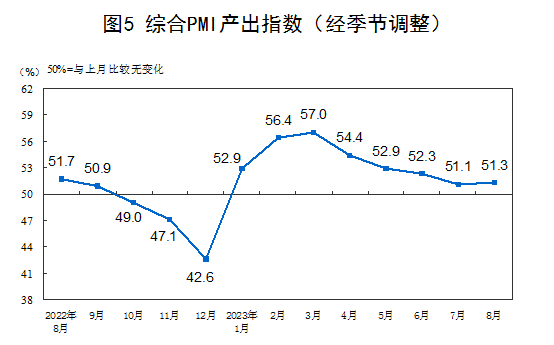 8月份,綜合PMI產(chan) 出指數為(wei) 51.3%,比上月上升0.2個(ge) 百分點,繼續保持在擴張區間,表明我國企業(ye) 生產(chan) 經營活動總體(ti) 穩定擴張。