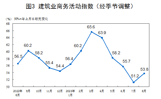 分行業(ye) 看,建築業(ye) 商務活動指數為(wei) 53.8%,比上月上升2.6個(ge) 百分點;服務業(ye) 商務活動指數為(wei) 50.5%,比上月下降1.0個(ge) 百分點。從(cong) 行業(ye) 看,鐵路運輸、航空運輸、住宿、餐飲、電信廣播電視及衛星傳(chuan) 輸服務、生態保護及公共設施管理、文化體(ti) 育娛樂(le) 等行業(ye) 商務活動指數位於(yu) 55.0%以上較高景氣區間;資本市場服務、保險、房地產(chan) 等行業(ye) 商務活動指數低於(yu) 臨(lin) 界點。