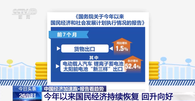 報告指出,前7個(ge) 月貨物出口同比增長1.5%,其中電動載人汽車、鋰離子蓄電池、太陽能電池“新三樣”出口合計增長52.4%。知識密集型服務貿易較快增長,旅行服務貿易明顯恢複,上半年服務進出口同比增長8.5%。推動外資標誌性項目落地實施,外貿外資平穩發展。