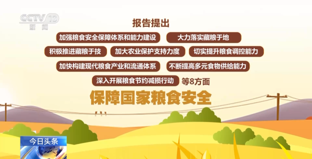 報告提出,將從(cong) 加強糧食安全保障體(ti) 係和能力建設、大力落實藏糧於(yu) 地、積極推進藏糧於(yu) 技、加大農(nong) 業(ye) 保護支持力度、切實提升糧食調控能力、加快構建現代糧食產(chan) 業(ye) 和流通體(ti) 係、不斷提高多元食物供給能力、深入開展糧食節約減損行動等8方麵,保障國家糧食安全。