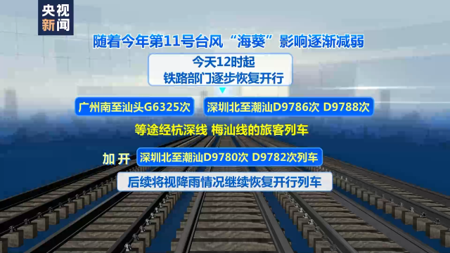 隨著今年第11號台風“海葵”影響逐漸減弱,5日12時起,鐵路部門逐步恢複開行廣州南至汕頭G6325次、深圳北至潮汕D9786次、D9788次等途經杭深線、梅汕線的旅客列車,加開深圳北至潮汕D9780次、D9782次列車。後續將視降雨情況,繼續恢複開行列車。