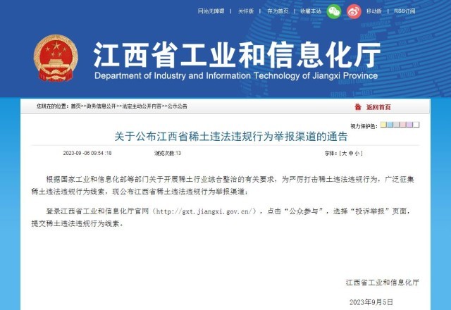 中新網9月6日電 據江西省工業(ye) 和信息化廳官網6日消息,根據國家工業(ye) 和信息化部等部門關(guan) 於(yu) 開展稀土行業(ye) 綜合整治的有關(guan) 要求,為(wei) 嚴(yan) 厲打擊稀土違法違規行為(wei) ,廣泛征集稀土違法違規行為(wei) 線索,現公布江西省稀土違法違規行為(wei) 舉(ju) 報渠道:登錄江西省工業(ye) 和信息化廳官網,點擊“公眾(zhong) 參與(yu) ”,選擇“投訴舉(ju) 報”頁麵,提交稀土違法違規行為(wei) 線索。