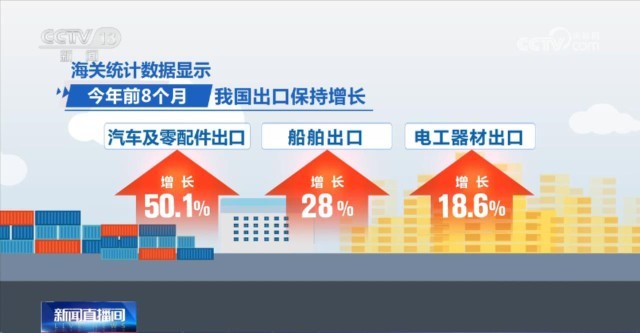 今年前8個(ge) 月,我國出口保持增長。其中,機電產(chan) 品出口8.97萬(wan) 億(yi) 元,同比增長3.6%,占同期我國出口總值的58%;汽車及零配件出口、船舶出口、電工器材出口分別增長50.1%、28%、18.6%。
