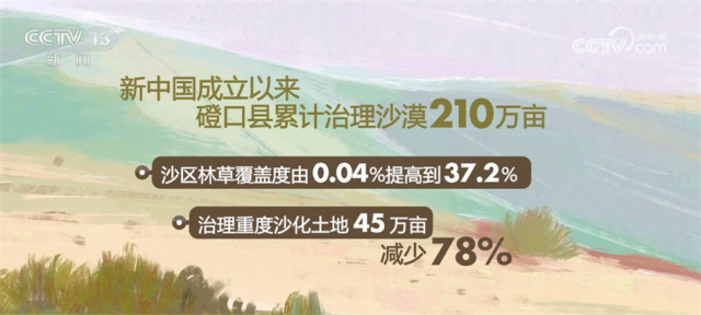 數據顯示,新中國成立以來,磴口縣累計治理沙漠210萬(wan) 畝(mu) ,沙區林草覆蓋度由0.04%提高到37.2%,治理重度沙化土地45萬(wan) 畝(mu) ,減少78%,向黃河年輸沙量減少到370萬(wan) 噸,降低94.7%,沙漠治理呈現出“整體(ti) 好轉、改善加速”的良好態勢,也因此形成了防沙治沙“磴口模式”。