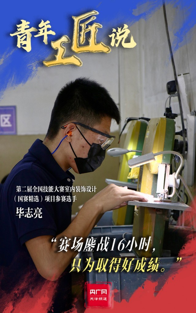 毫厘之間,精益求精。麵對共計16個(ge) 小時的比賽時長,來自天津鐵道職業(ye) 技術學院,室內(nei) 裝飾設計(國賽精選)項目參賽選手畢誌亮並未膽怯退縮,備賽過程中,他不斷加強對比賽規則的學習(xi) 和理解,夯實理論基礎,練習(xi) 中反複討論研磨,完善工藝流程,不斷提升作品的評價(jia) 觀感及測量精度,力爭(zheng) 做到技術和藝術的完美結合。對於(yu) 比賽,畢誌亮信心滿滿,他將鏖戰16小時,爭(zheng) 取好成績。