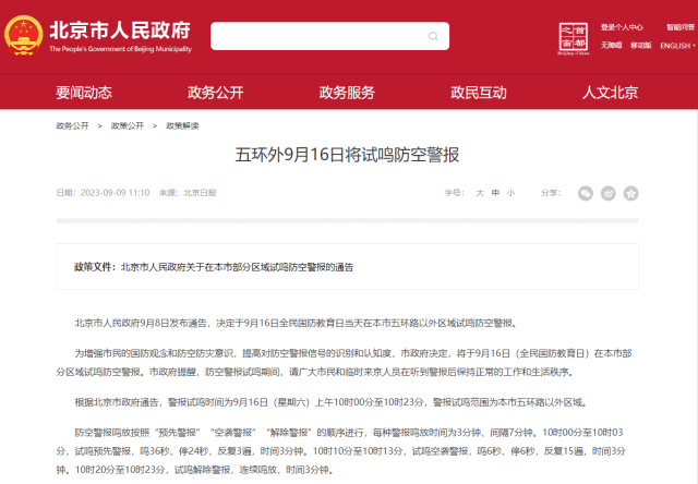 北京市人民政府9月8日發布通告,決(jue) 定於(yu) 9月16日全民國防教育日當天在本市五環路以外區域試鳴防空警報。