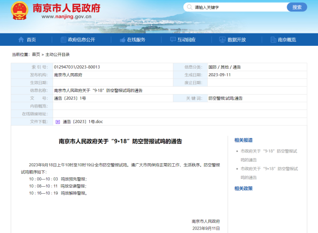 據南京市人民政府通告,9月18日上午10時至10時19分南京全市防空警報試鳴。