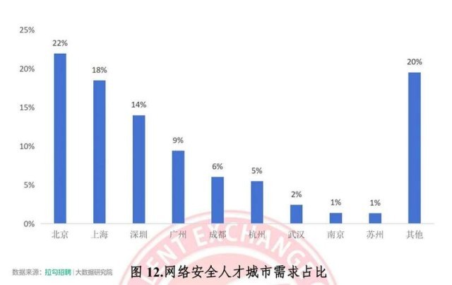 根據國家智慧教育公共服務平台數據,2023年網絡安全相關(guan) 本科專(zhuan) 業(ye) (信息安全、網絡空間安全、網絡安全與(yu) 執法)畢業(ye) 生規模約為(wei) 1.45 萬(wan) 人。總體(ti) 上,網絡安全產(chan) 業(ye) 人才供需關(guan) 係為(wei) 供不應求。《報告》稱,根據拉勾招聘平台數據顯示,最新網絡安全人才需求排名前六的城市分別是北京、上海、深圳、廣州、成都和杭州,占據市場總需求的75%左右。