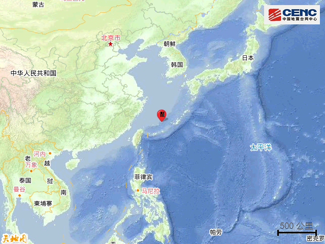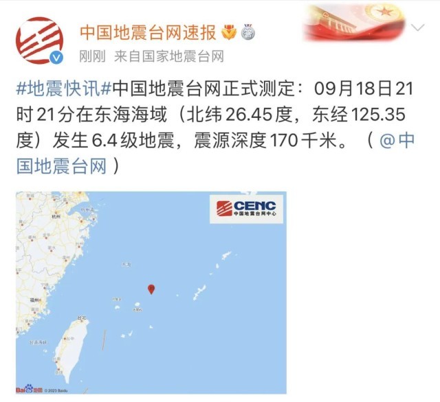 中國地震台網正式測定:09月18日21時21分在東(dong) 海海域(北緯26.45度,東(dong) 經125.35度)發生6.4級地震,震源深度170千米。
