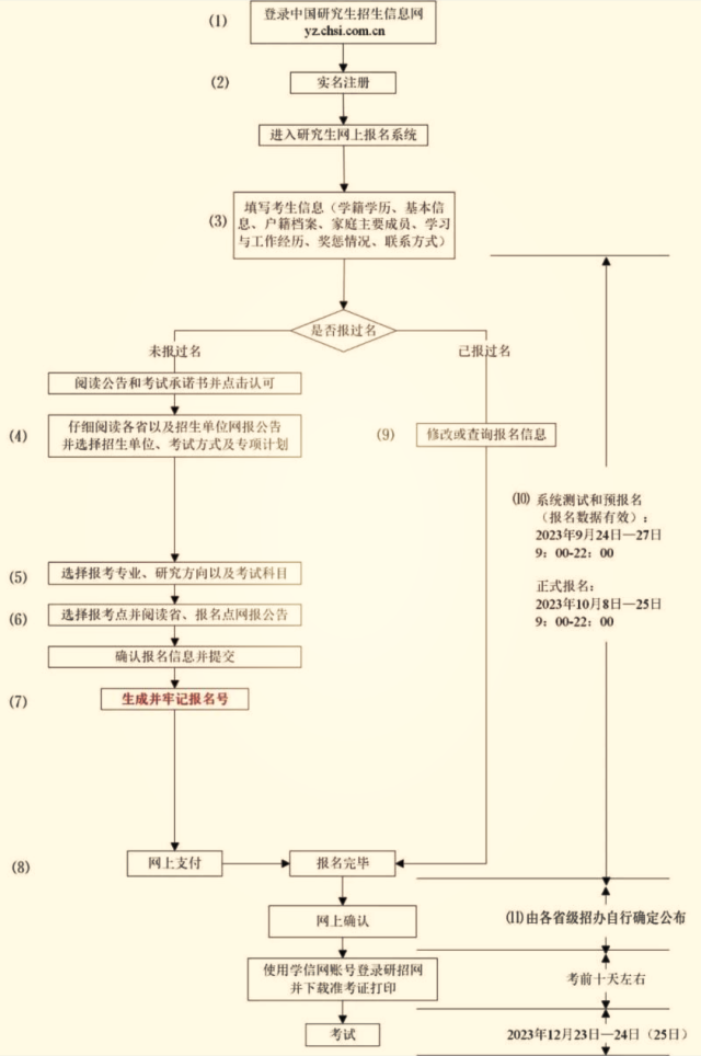(1)考生應在規定時間登錄“中國研究生招生信息網”(網址:https://yz.chsi.com.cn)瀏覽報考須知,並按省級教育招生考試機構、報考點以及報考招生單位的網上公告要求報名;