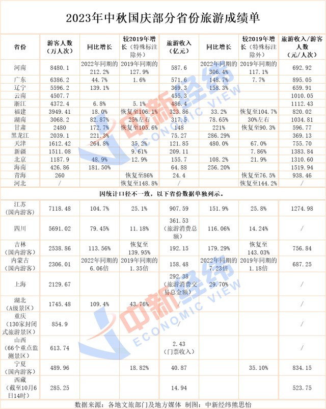 截至10月7日21時,25省份公布雙節旅遊成績單。其中,河南接待遊客量居首位,達8480.1萬(wan) 人次,旅遊收入587.6億(yi) 元,均創新高。