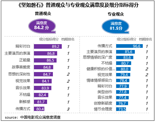 張藝謀導演新作《堅如磐石》獲得觀眾(zhong) 滿意度評分84.1分,居2023年國慶檔調查五部影片首位,作為(wei) 聚焦反腐反黑的警匪題材影片,對於(yu) 社會(hui) 現實以及人性的描摹深度和豐(feng) 富層次得到了觀眾(zhong) 的高度好評,思想性得分85.4分,為(wei) 三大指數中最高,觀賞性得分84.4分,為(wei) 檔期最高分,其中主要演員的表演得到了不同觀眾(zhong) 的高度評價(jia) ,在2023年調查的50部影片中分別居普通觀眾(zhong) 評價(jia) 的第6位和專(zhuan) 業(ye) 觀眾(zhong) 評價(jia) 的第3位。