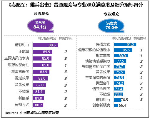 陳凱歌執導的抗美援朝題材影片《誌願軍(jun) :雄兵出擊》觀眾(zhong) 滿意度83.8分,影片主題立意與(yu) 國慶氛圍貼合,思想性得分85.0分,影片全景式呈現抗美援朝曆史,所傳(chuan) 遞的愛國精神和英雄氣概震撼人心,有85%的受訪觀眾(zhong) 表示在觀賞影片後感動不已。