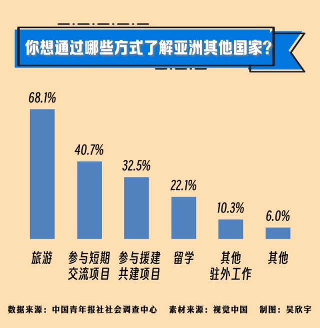 你會(hui) 通過什麽(me) 方式了解亞(ya) 洲?68.1%的受訪者選擇了旅遊,40.7%的受訪者選擇參與(yu) 短期交流項目,32.5%的受訪者選擇參與(yu) 援建共建項目,其他還有留學(22.1%)、駐外工作(10.3%)。