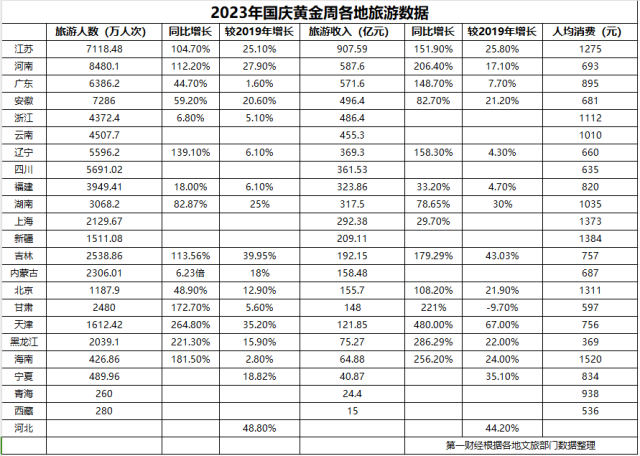 不僅(jin) 如此,第一財經梳理發現,今年五一期間,人均消費超過1000元的省份有浙江、上海、北京和海南等4個(ge) 省份,而今年國慶人均消費超過1000元的省份有海南、新疆、上海、北京、江蘇、浙江、湖南和雲(yun) 南等8個(ge) 省份。
