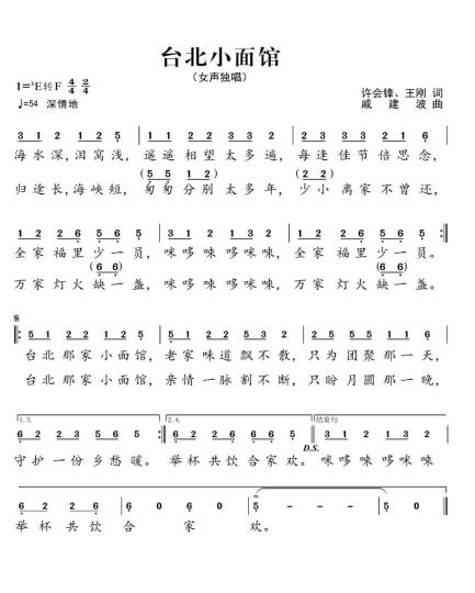 圖為(wei) 兩(liang) 岸主題歌曲《台北小麵館》曲譜。福建省音樂(le) 家協會(hui) 供圖