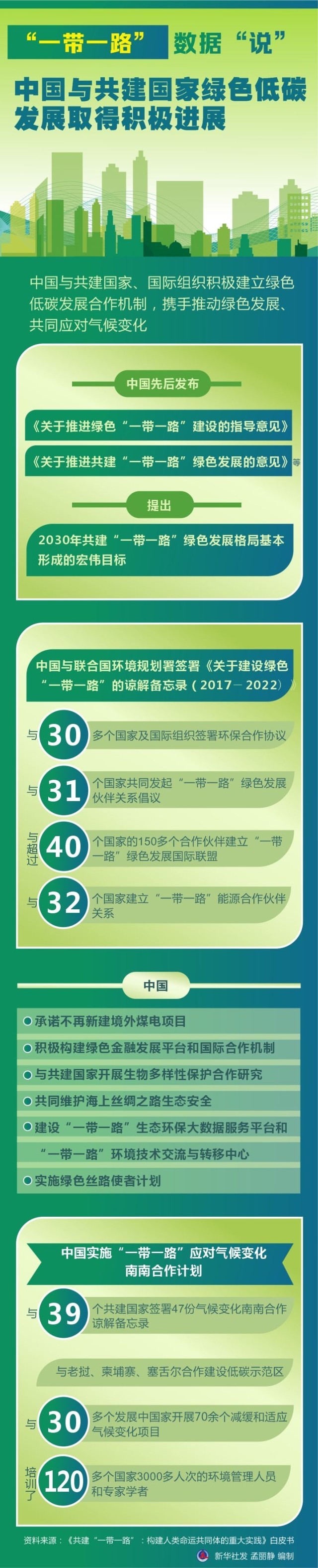 綠色低碳發展取得積極進展。中國與(yu) 共建國家、國際組織積極建立綠色低碳發展合作機製,攜手推動綠色發展、共同應對氣候變化。中國先後發布《關(guan) 於(yu) 推進綠色“一帶一路”建設的指導意見》《關(guan) 於(yu) 推進共建“一帶一路”綠色發展的意見》等,提出2030年共建“一帶一路”綠色發展格局基本形成的宏偉(wei) 目標。