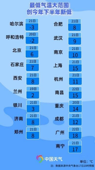 中東(dong) 部地區最低氣溫的低點大多在20—21日,從(cong) 黑龍江到廣東(dong) 、廣西,大部地區最低氣溫都有可能創下今年立秋以來的新低,迎來最涼早晨。