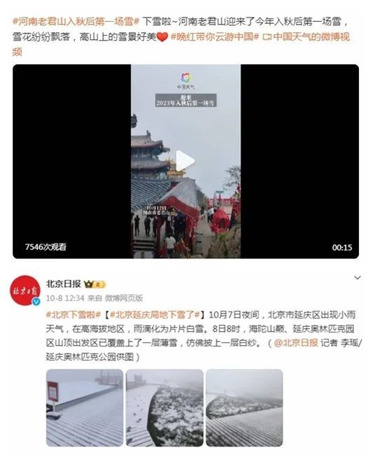 而在此之前,河南老君山就已經迎來了入秋以來的第一場雪,甚至在北京延慶的高海拔山區也迎來了降雪。