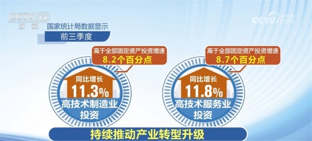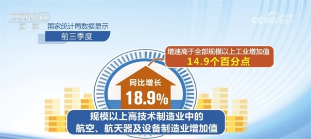 高技術產(chan) 業(ye) 投資動力強勁,新動能領域保持較快增長。國家統計局數據顯示,前三季度,高技術製造業(ye) 投資和高技術服務業(ye) 投資分別同比增長11.3%和11.8%,分別高於(yu) 全部固定資產(chan) 投資增速8.2和8.7個(ge) 百分點,持續推動產(chan) 業(ye) 轉型升級。規模以上高技術製造業(ye) 中的航空、航天器及設備製造業(ye) 增加值同比增長18.9%,增速高於(yu) 全部規模以上工業(ye) 增加值14.9個(ge) 百分點。