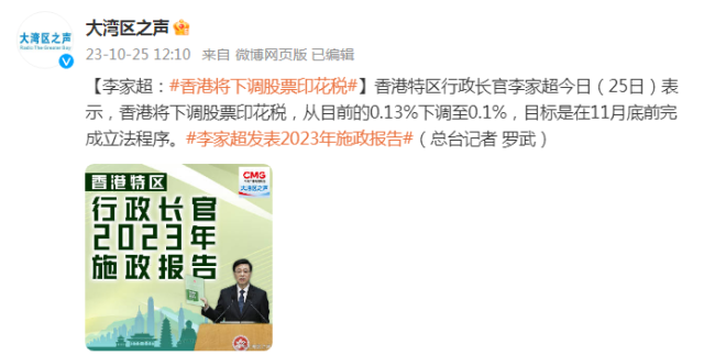 香港特區行政長官李家超今日(25日)表示,香港將下調股票印花稅,從(cong) 目前的0.13%下調至0.1%,目標是在11月底前完成立法程序。(總台記者 羅武)