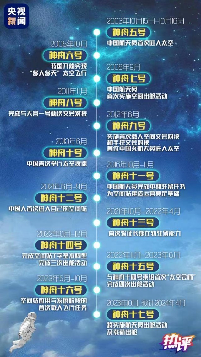飛天20載,所向皆星河。從(cong) 神五到神十七,從(cong) 首次太空飛行到長期駐守空間站,20年間,我國載人航天事業(ye) 實現跨越式發展,載人航天工程發射任務實現30戰30捷。有太多高光時刻值得銘記,每一步都夯實基礎,每一步都標定未來。